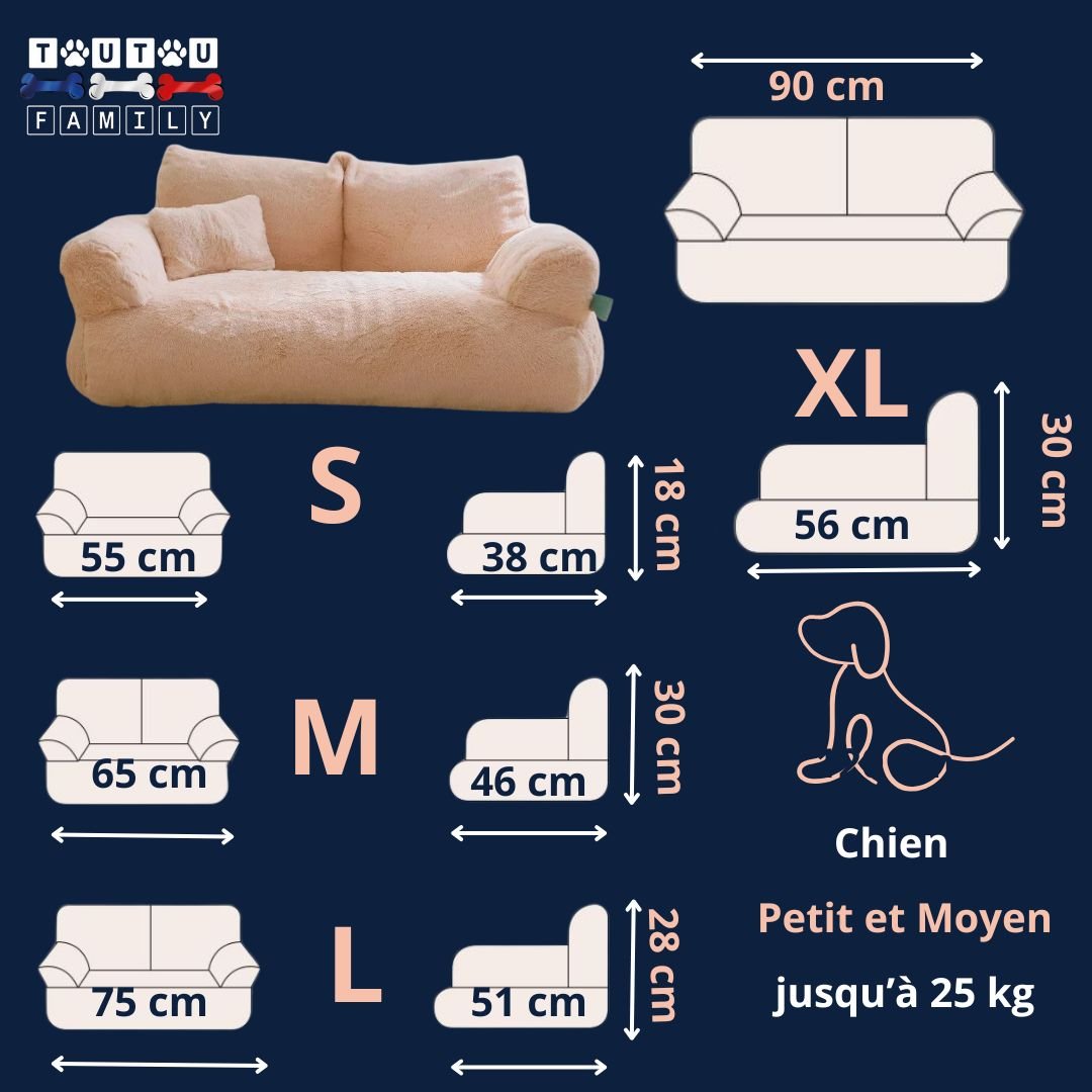 Disponibles en quatre tailles précisément calibrées (S jusqu'à 5 kg, M jusqu'à 9 kg, L jusqu'à 15 kg et XL jusqu'à 20 kg), nos canapés s'adaptent à toutes les races.